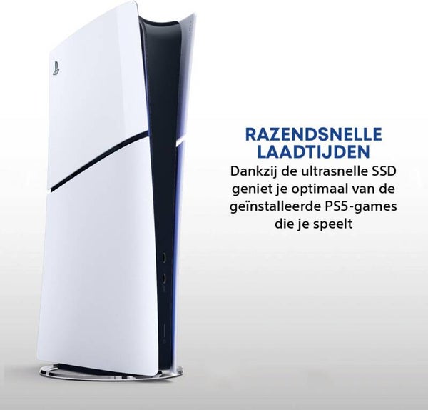 Play Has No Limits met de PS5 Slim - Digital Edition! De slimme PS5-console ontketent nieuwe gamingmogelijkheden die je nooit had voorzien. Laden gaat sneller dan ooit dankzij een ultrasnelle SSD. Er staat een helen ieuwe generatie geweldige PlayStation-games voor je klaar, waar je nog dieper in kunt duiken dankzij ondersteuning voor haptische feedback, adaptieve triggers en 3D-audio.