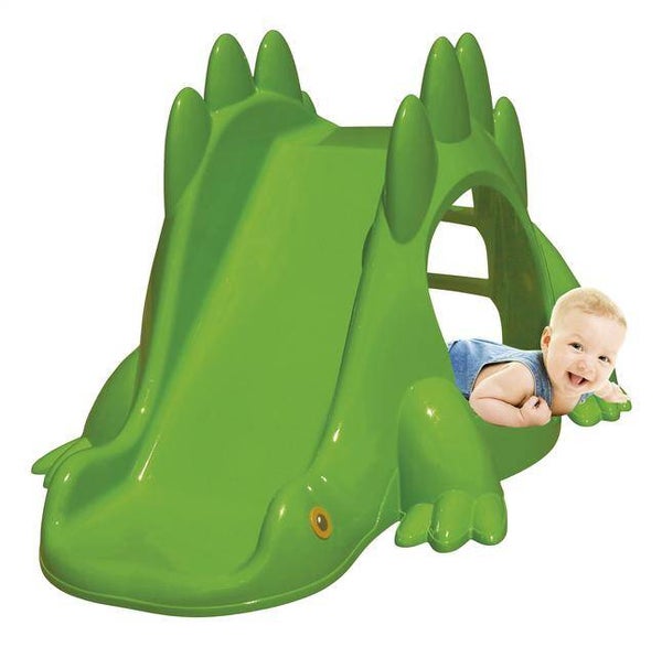 Glijbaan in de vorm van een dinosaurus, met een plekje onder de glijbaan waar kinderen zich kunnen verstoppen.
